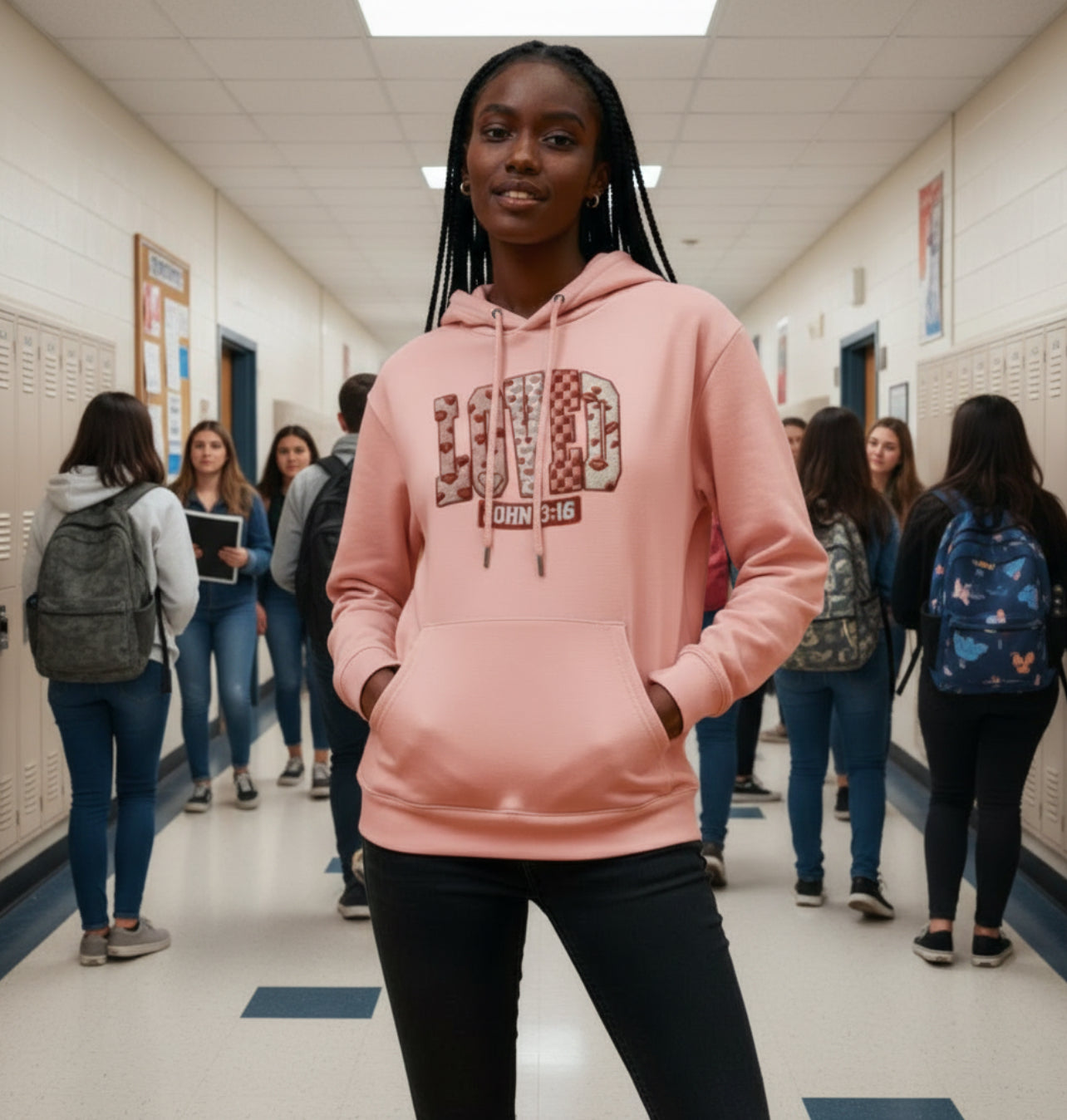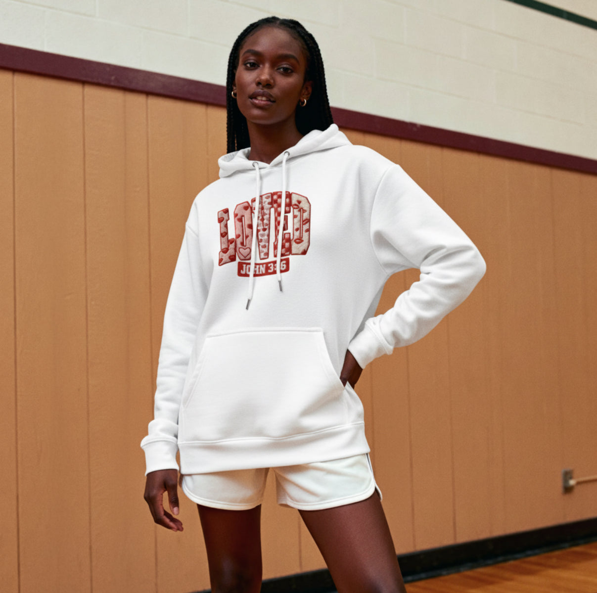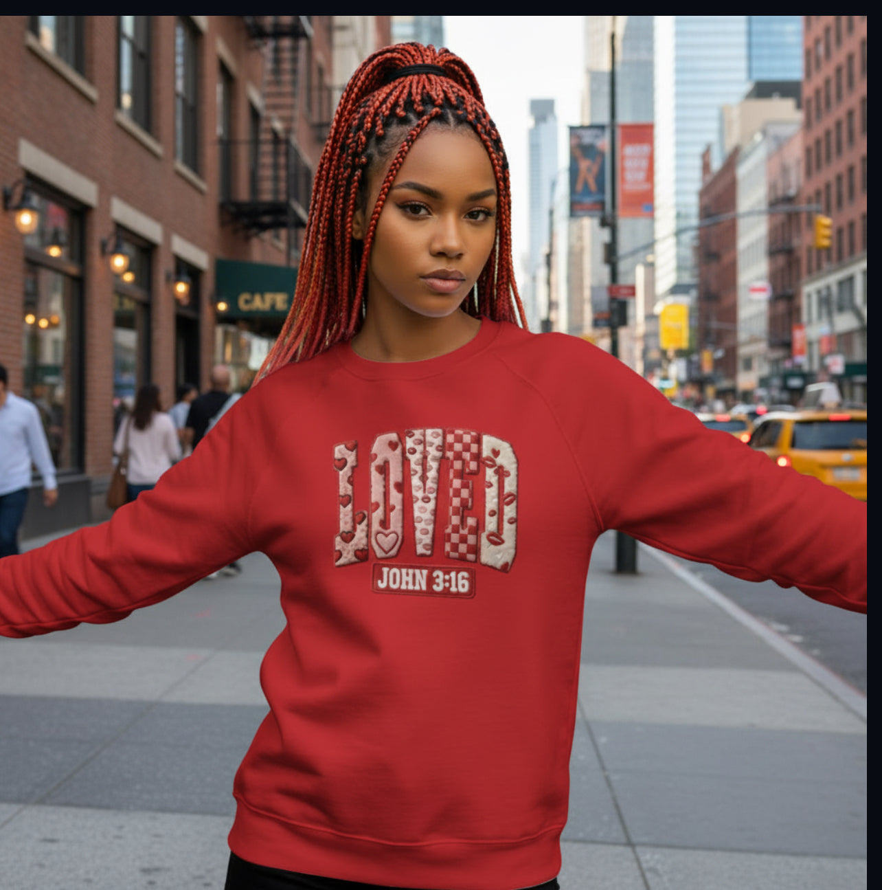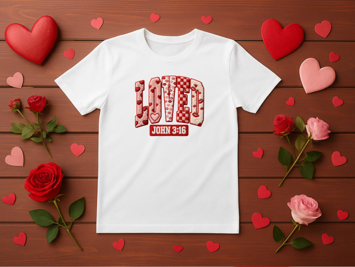 Celebrate love that never fades. This AKED exclusive features the word LOVED in bold, patterned letters—hearts, lips, and checkers in red and pink tones—framed by the timeless truth of John 3:16. Designed for those who wear their faith with style, this tee is perfect for Valentine’s Day, date nights, or everyday reminders of divine love.